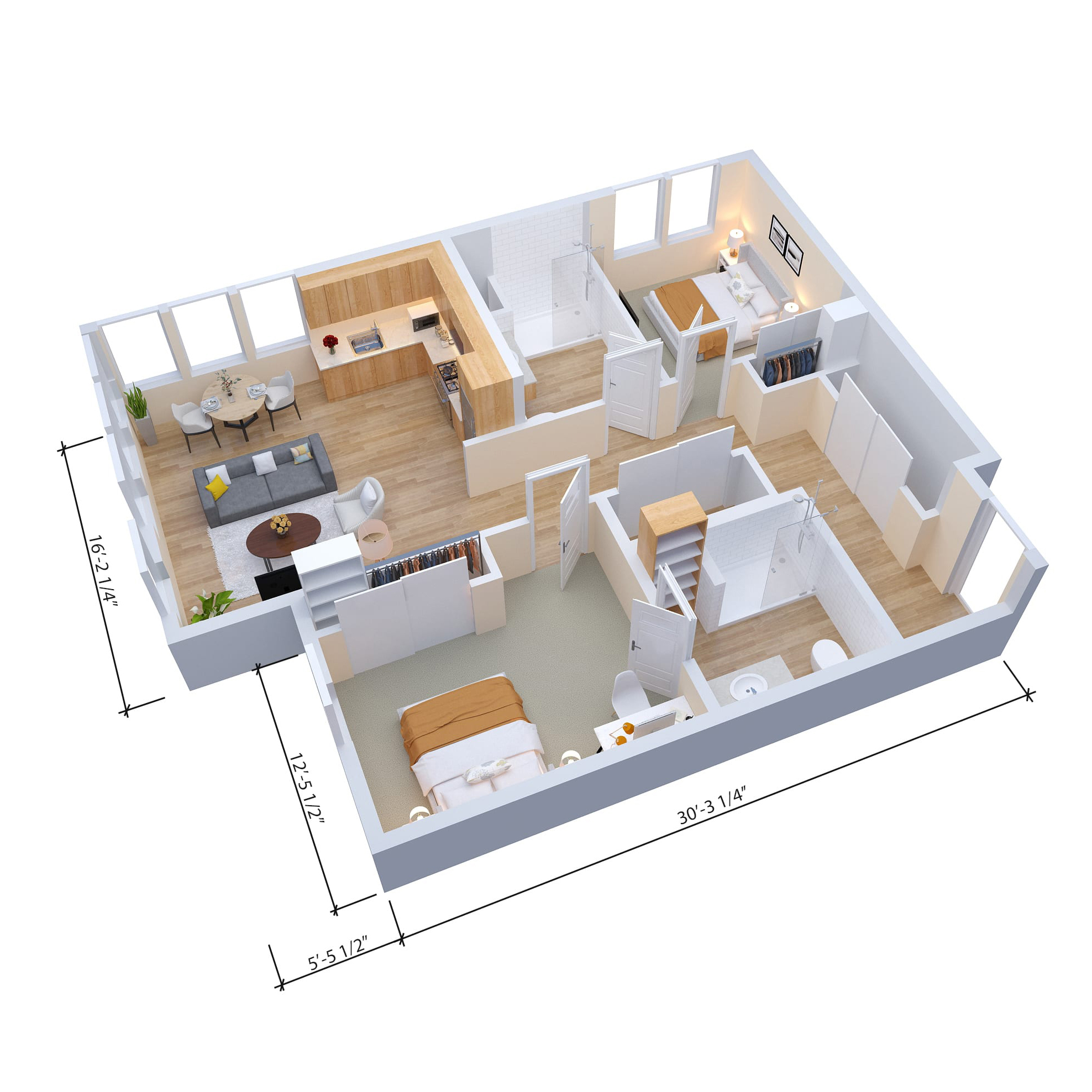 Two-bedroom apartments feature generous space, ideal for those who want room to relax or entertain.